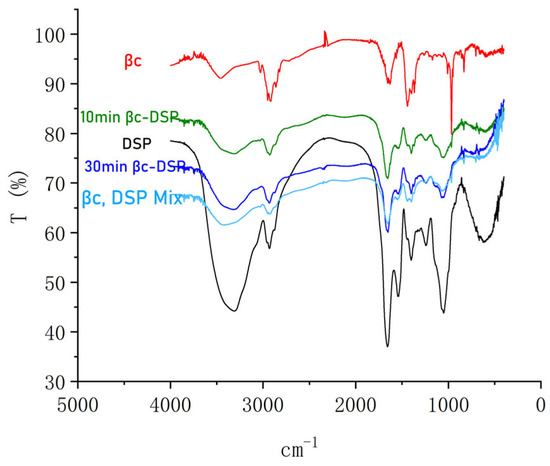 The infrared spectrum of the dry nutrition delivery system. βc: β-carotene; DSP: Defatted soybean particles; 10 min βc-DSP: ball mill again for 10 min; 30 min βc-DSP: ball mill again for 30 min.