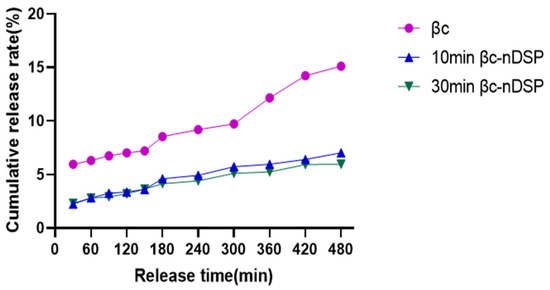 The cumulative release rate of β-carotene is presented in Figure 2. The cumulative release rate of free β-carotene, 10 min βc-nDSP, and 30 min βc-nDSP were 15.1%, 7.0%, and 6.0% in 8 h, respectively. Release model fitting was performed on the release curves to compare the mass transport mechanism of the different samples [30]. The release of free β-carotene fitted the zero-order model, while in the complexes, the release from NDS better fitted the Higuchi model (see Supplementary Materials). These results also demonstrated that the dry nutrition delivery system was prepared successfully and slowed down the release of β-carotene.
