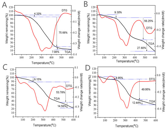 Thermogravimetry (TGA) and differential thermogravimetry (DTG) analyses for the NDS were carried out on 4–6 mg samples using a SDT Q600 TG/DSC thermal analyzer (TA Instrument Corp., New Castle, DE, USA) at a heating rate of 10 °C/min from 30 to 600 °C with a constant nitrogen flow of 20 mL/min [39].