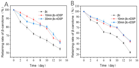 In solution, the retaining rates of free β-carotene, 10 min βc-DSP, and 30 min βc-DSP stored for 14 days under dark conditions at 55 °C were 24.2%, 44.1%, and 50.7%, respectively, while they were 54.6%, 63.6%, and 61.8%, respectively, under UV irradiation at room temperature. As shown in Figure 4, the retention of β-carotene in NDS is always higher than in the free one. The β-carotene in NDS is obviously stabler than the sample in solution [33,34].