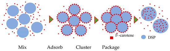 In the dry β-carotene delivery system, the aggregation of DSPs [21] contributes to the construction. The schematic diagram in Figure 6 describes the formation of a dry NDS. When mixed with DSPs, β-carotene is adsorbed onto the surface of the particles [37]. Combined with the aggregation of DSPs, those β-carotenes move into the cluster. The clusters are then broken during milling, and the β-carotene is packaged inside at the same time. Up to 89% β-carotene can be packaged into the NDS within 30 min.