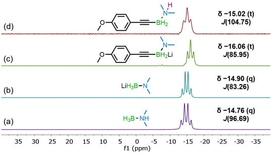 11B NMR peaks observed during reaction monitoring experiment; (a) dimethylamine-borane starting material, (b) lithium dimethylaminoborohydride after n-BuLi addition, (c) lithium dimethylaminoalkynylborohydride following dehydroborylation, (d) final product obtained after water quench.