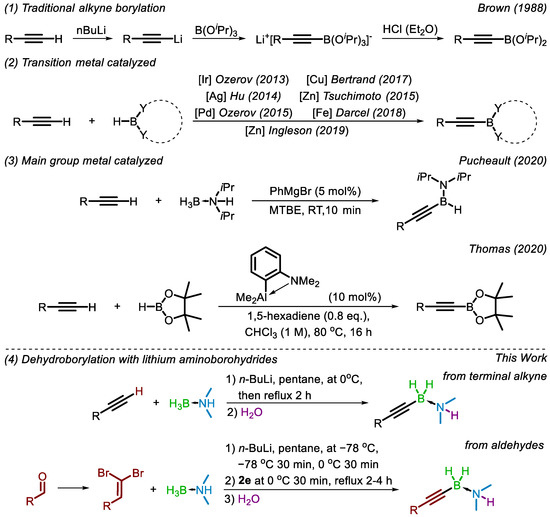 - Birepinte, M.; Liautard, V.; Chabaud, L.; Pucheault, M. Magnesium-Catalyzed Tandem Dehydrogenation-Dehydrocoupling: An Atom Economical Access to Alkynylboranes. Chem. Eur. J. 2020, 26, 3236–3240. [Google Scholar] [CrossRef] [PubMed]