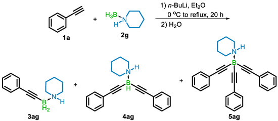 LAB reagents are generated from the reaction of an amine-borane with n-butylithium (n-BuLi) and are best known for their powerful and selective reducing properties, similar to lithium aluminum hydride [17]. When prepared with a slight deficit of n-BuLi, LAB reagents are air-stable solids. Initially, we were investigating LAB reagents as activated derivatives of amine-boranes for the hydroboration of alkynes, as most amine-boranes themselves do not hydroborate under ambient conditions [18,19]. A reaction of phenylacetylene (1a) and lithium piperidinoborohydride prepared from piperidine-borane (2g) was found to provide a series of alkynylated amine-boranes, not the hydroboration product (Scheme 2).