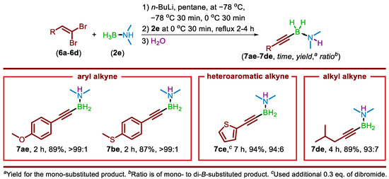 To expand the scope of available terminal alkyne substrates, a modified method was envisioned. Terminal alkynes can be produced from aldehydes by reaction with a triphenylphosphine-dibromomethylene ylide formed from carbon tetrabromide and triphenylphosphine to yield a 1,1-dibromoolefin. Reaction of the dibromoolefin intermediate with n-BuLi yields the terminal alkyne, with the overall process known as the Corey–Fuchs reaction [22]. By isolating the 1,1-dibromoolefin intermediate and using that as the starting material, the Fritsch–Buttenberg–Wiechell rearrangement [23,24,25] would be performed in situ, and the lithium acetylide generated would go on to provide the borylated alkyne upon reaction with 2e. To examine this potential alternative route to the alkynylborane-amine products, 3be was selected as a target to have a direct comparison between the results of two methods. Using 4-methoxybenzaldehyde, 1-(2,2-dibromovinyl)-4-methoxybenzene (6a) was prepared using a reported procedure [22]. An initial reaction maintaining a 6a to 2e ratio of 1 to 2, while increasing the n-BuLi equiv. to 3.865, provided only 10% of the desired 7ae. This low yield is attributed to the presence of excess n-BuLi, allowing both LAB reagent and lithium acetylide to be present in the reaction. Refinement of the reaction stoichiometry (see Supporting Information) led to an optimal 6a to 2e to n-BuLi ratio of 1:2:2.3. These conditions afforded 7ae in 89% yield with a mono- to diborylated product ratio ≥99:≤1. Following this success, a series of 1,1-dibromoolefins (6b–6d) were prepared from 4-(methylthio)benzaldehyde, thiophene-2-carbaldehyde, and isovaleraldehyde. Substrates 6b–6d were then subjected to the optimized conditions, and provided the corresponding alkynylated borane-amines 7be, 7ce, and 7de in 87%, 99%, and 89%, respectively, demonstrating the compatibility of aryl, heteroaromatic, and alkyl 1,1-dibromoolefins with the devised protocol (Scheme 5).