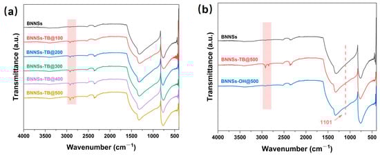 (a) FT-IR spectra of BNNSs-TB with different doses. (b) FT-IR spectra of BNNSs, BNNSs-TB@500, and BNNSs-OH@500.
