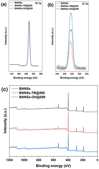 (a) N 1s peak in XPS spectra, (b) O 1s peak in XPS spectra, and (c) XPS spectra of BNNSs, BNNSs-TB@500, and BNNSs-OH@500.