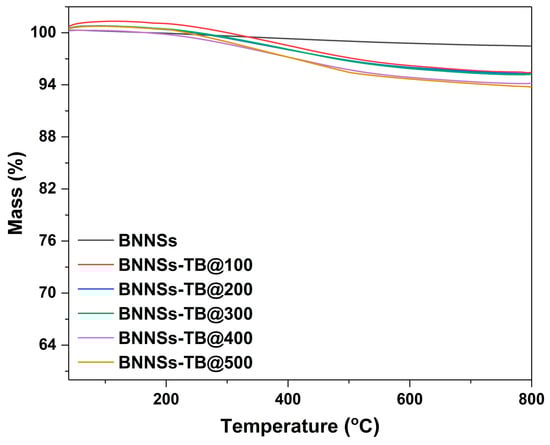 TG analysis of the purified and dried BNNSs-TB prepared with different doses was conducted to quantify the organic fraction grafted to the BNNSs. As shown in Figure 4, the mass loss of BNNSs-TB grew with irradiation doses. In addition, the plot of BNNSs-TB@500 shows the highest mass loss was 6.2%, whereas only a very slight mass loss can be observed in the curve of unmodified BNNSs until reaching a temperature of ∼800 °C. It is speculated that the significant decrease in mass loss between 200 and 400 °C can be attributed to the pyrolysis of covalently grafted organic tert-butoxy groups. Taking the mass loss of 6.2% into account, the BNNSs-TB@500 yielded a functionalization of ∼2.7% of boron atoms in the h-BN lattice. This grafting rate is comparable to that (about 4%) obtained by the representative hydrothermal method [23], whereas the amount of TBP used in this work is only one-tenth of its counterpart. We speculate that the improved yield rate and reduced usage of organic chemicals in this work was due to the affluent oxygen radicals decomposed from TBP under irradiation. Meanwhile, the high energy of the electron beam also helped promote the breaking of B-N bonds and further increase the grafting ratio. Considering that the time-consuming organic radical oxidation procedure for BNNSs-TB@500 took only about 2.5 h, whereas the previous reported hydrothermal reaction needed 12 h at 120 °C, the novel modification method of BNNSs incorporated with electron beam irradiation, a feasible and mature commercial technology [29,30], will obviously have better economic prospects.