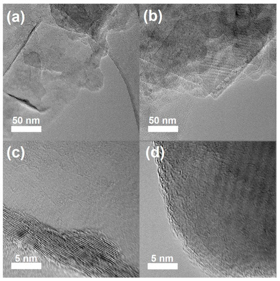 TEM images of (a) BNNSs and (b) BNNSs-OH@500. HRTEM images of (c) BNNSs and (d) BNNSs-OH@500.