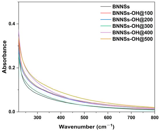 It is widely accepted that the hydroxylation of inorganic nanoparticles will significantly optimize their water solubility. Therefore, UV-vis spectroscopy was carried out to investigate the change in water solubility of the BNNSs-OH relative to unmodified BNNSs. As before, BNNSs-OH and pristine BNNS samples were dispersed in deionized water with a concentration of 1 mg/mL via bath sonication for 12 h. To remove any aggregated and insoluble composition, the supernatant was then centrifugated at 10,000 rpm for 30 min and allowed to equilibrate by standing for 24 h before analysis. The UV-vis spectra of the as-equilibrated BNNSs-OH and BNNS solution are shown in Figure 6. It was found that the spectra of BNNSs-OH had substantially increased absorbencies compared to pristine BNNSs, and the spectrum of BNNSs-OH@500 showed the highest absorbance intensity among all samples. This indicates that BNNSs-OH@500 possesses higher water solubility in comparison to other hydroxylated BNNSs and pristine BNNSs. This difference in water solubility suggests that there are more grafted hydroxyl groups on BNNS-OH@500. The enhanced water solubility is also demonstrated by the optical photograph of BNNSs and BNNSs-OH aqueous solution shown in Figure S5. It is clear that the BNNSs-OH@500 aqueous solution shows a darker color, indicating its higher soluble concentration. In addition, the obvious Tyndall effect visible in Figure S5b also certifies the uniform dispersion of modified BNNSs.