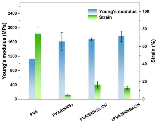 Young’s modulus and strain of PVA, PVA/BNNSs, PVA/BNNSs-OH, and cPVA/BNNSs-OH films.
