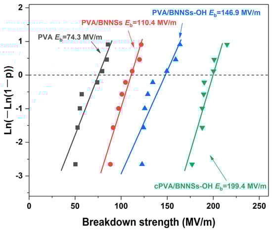 The breakdown strength (Eb) of raw PVA and of PVA-based nanocomposites was analyzed using the two-parameter Weibull statistical distribution, which is given as P(E) = 1 − exp((−E/Eb)β). In this function, P(E) is the cumulative probability of electrical failure, E is the measured value of breakdown strength, Eb represents the characteristic Weibull breakdown strength (which means the sample has a probability of 63.2% to breakdown under the applied electrical field), and β is used to evaluate the dispersion of data [32,33]. In this work, at least eight samples were tested for each Weibull fitting. The statistical Eb values of different samples are given in Figure 8. It is clear that the nanocomposites show increased Eb values with the loading of BNNSs nanofillers. For instance, the Eb of pristine PVA was only 74.3 MV/m, whereas those of PVA/BNNSs and PVA/BNNSs-OH were 110.4 MV/m and 149.6 MV/m, respectively. As expected, the cPVA/BNNSs-OH nanocomposite possessed the highest Eb of 199.4 MV/m, which is 168% higher than that of pristine PVA.
