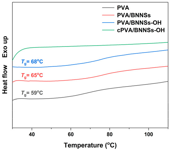 DSC analyses of PVA, PVA/BNNSs, PVA/BNNSs-OH, and cPVA/BNNSs-OH.