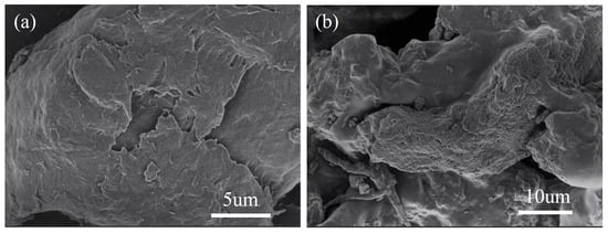 Figure 1 shows the SEM images of chitosan (CS) and pyridine-modified chitosan (PYCS). The pristine CS exhibited a smooth surface and layered structure (Figure 1a) while the CS modified with pyridine displayed some irregular aggregates with a loose honeycomb structure (Figure 1b). The flake-like particles were formed by glutaraldehyde crosslinking chitosan. The surface with plenty of irregular pores increased the surface area, indicating abundant binding sites for metal ion adsorption.