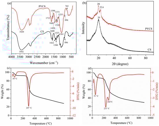 (a) FTIR spectra, (b) XRD spectra, and TGA–DTG curves ((c): CS, (d): PYCS).