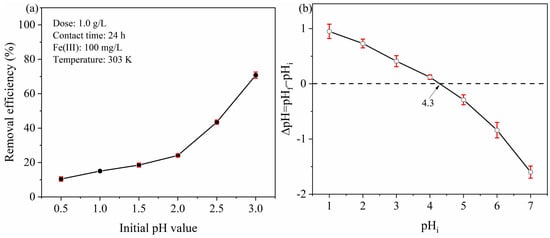 The pH value of solution is one of the most important factors for adsorption of PYCS, because it influences the ionization state of functional groups [,]. The pH should be set below 3 because of the metal precipitation at higher pH levels is not in line with the real wastewater quality. The Fe (III) adsorption experiments were performed at different pH values (from 0.5 to 3). It can be seen from Figure 3a that with the increase in pH value, the removal efficiency of Fe (III) increased significantly. The overall trend was increasing, but it was not obvious when the acid was strong. The reason was that the N atom on the pyridine ring was protonated and positively charged in extremely acidic solution [], which weakened its chelating ability with Fe (III). The lower the pH, the more evident the protonation, thus leading the removal efficiency to rise slowly []. When the pH was 3, the removal efficiency was significantly improved, mainly due to part of Fe (III) precipitation. Additionally, the pHPZC value of PYCS adsorbent was examined to be 4.3 using the pH drift method (Figure 3b). When the solution pH value was less than pHPZC, the surface of the PYCS adsorbent was positively charged, which was not conducive to Fe (III) adsorption. Based on the precipitation of Fe (III) at a pH greater than 2.7, the solution pH was chosen to be 2.5 in the subsequent experiments.