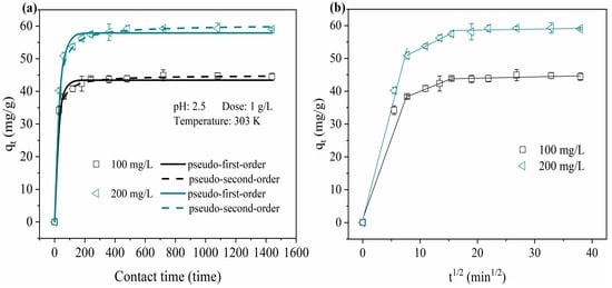 To investigate the rate-limiting step in the adsorption mechanisms, the kinetic experimental data were fitted with Lagergren’s pseudo-first-order, Ho’s pseudo-second-order, and intra-particle diffusion kinetic models [,,]. The nonlinear form equations for the three models were expressed as follows in Equations (1)–(3).