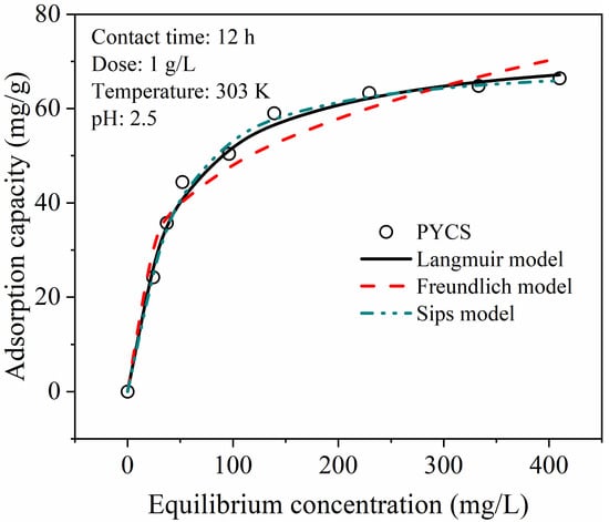 Adsorption isotherm is usually used to study the interaction between the adsorbent and pollutant in equilibrium, and can also estimate the maximum adsorption capacity of the adsorbent for further comparison with adsorbents reported in other studies. As can be seen from Figure 5, with the increase in the initial Fe (III) concentration, the adsorption of Fe (III) by PYCS gradually increased and reached surface saturation at high concentration. This was because at a lower initial Fe (III) concentration, PYCS adsorption active sites were enough to hold the adsorbate, and the interaction sites were not saturated. As the concentration of Fe (III) increased, almost all active sites on the surface of the adsorbent were occupied, leaving the Fe (III) uptake unchanged, then the adsorption capacity for Fe (III) would reach the maximum. In this study, the maximum adsorption capacity of PYCS was 66.20 mg/g.