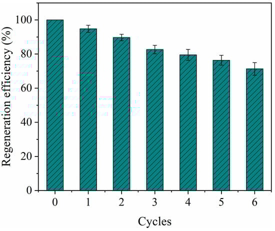 As the reusability of the adsorbent was very important for its industrial application, the adsorption–desorption cycles were conducted six times to further evaluate the reusability of the as-prepared PYCS. As observed from Figure 6, the adsorption ability slightly decreased as the number of cycles increased. After six cycles, the adsorption capacity of PYCS was maintained at 71% of that of the first cycle. The decrease of adsorption capacity may be the loss or degradation of adsorbent []. In addition, the incomplete removal of Fe (III) ions in the adsorbent by the eluent may be another reason for the reduction of adsorption capacity. Overall, PYCS showed a good reusability and had great potential as an efficient adsorbent for the removal of Fe (III) ions from polluted water.