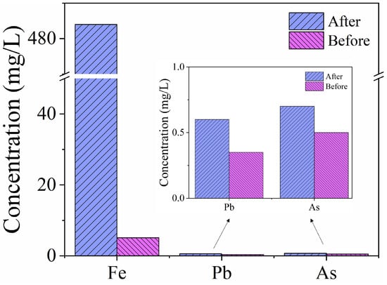 The prepared materials were used for the adsorption of heavy metals in real acidic wastewater to evaluate the practical applicability. The results are in Figure 7. It can be found that the removal rates of Fe (III), Pb (II), and As (III) were 98.9%, 34.5%, and 28.6%, respectively. The results proved PYCS as a potential material for heavy metal removal in water treatment with high efficiency.