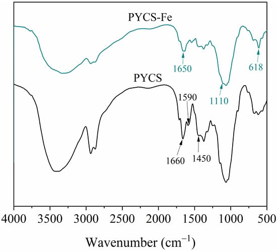The adsorption mechanism of PYCS was investigated by examining the XPS and FT-IR data. The FT-IR spectra of the PYCS before and after loading with Fe (III) are shown in Figure 8. For PYCS, the adsorption band near 1450 cm−1 corresponded to the stretching vibrations of C−N, and the adsorption feature near 1590 cm−1 was caused by skeletal vibration of pyridine. After adsorption, the strength of the C=N (1660 cm−1) bonds reduced and moved at a minor wave length, confirming that pyridines were the functional groups of PYCS, forming coordinate bonds with Fe (III) []. The stretching vibration of pyridine at 1590 cm−1 and that of C−N at 1450 cm−1 were significantly weakened and almost disappeared after adsorption, indicating that pyridine was involved in the chelating interaction with Fe (III). The appearance of new peaks at 1110 cm−1 and 618 cm−1 corresponded to the stretching vibration of  ions after adsorption [].