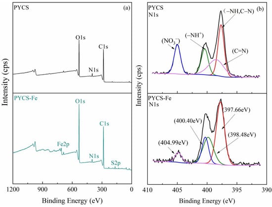 Characterization of PYCS before and after Fe (III) adsorption: (a) XPS wide scan spectra. (b) XPS spectra of N1s.