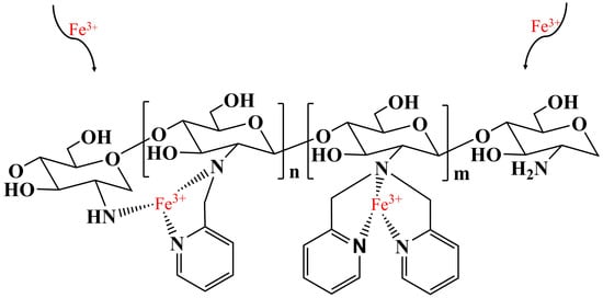 Chitosan (>95% deacetylated, 100–200 mPa s, M.wt%. 6.9 × 105) was supplied from the Aladdin Industrial Corporation (Shanghai, China). Acetic acid (CH3COOH, AR), sodium hydroxide (NaOH, AR), and 2-Chloromethylpyridine hydrochloride (C6H6ClN·HCl, AR) were all purchased from Macklin Biochemical Co., Ltd. (Shanghai, China). Ethanol (CH3CH2OH, AR), glutaraldehyde, sodium carbonate (Na2CO3, AR), nitric acid (HNO3, AR), ferric sulfate (Fe2(SO4)3, AR), sulfuric acid (H2SO4, AR), and hydrochloric acid (HCl, AR) were supplied by Sinopharm Chemical Reagent Co., Ltd. (Shanghai, China), all reagents of which were analytical grade and used directly without further purification. All water mentioned in this study was deionized water (18.2 MΩ cm). The metal concentrations in as-pretreated real acidic wastewater from an iron and steel industry in Central China, were determined, as listed in Table 5.