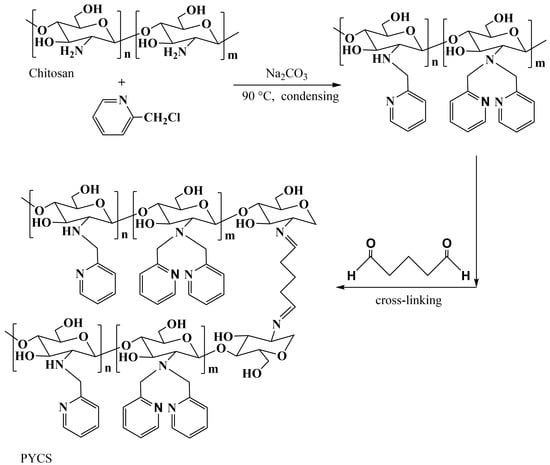 The preparation procedures of pyridine-modified chitosan (PYCS) adsorbent were as follows: Firstly, 1 g of chitosan was dissolved in 50 mL of acetic acid (2% v/v). Then, 250 mL of NaOH (0.5 mol/L) was slowly added dropwise to form chitosan beads. The mixture was stirred for 3 h. After separation, the particles were washed to neutrality with deionized water and ethanol.