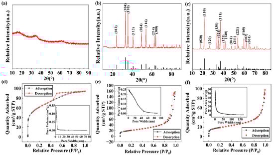 XRD patterns of iron minerals with different crystallinity: (a) ferrihydrite, (b) hematite, and (c) goethite. N2 adsorption/desorption isotherms and pore size distribution of (d) ferrihydrite, (e) hematite, and (f) goethite. a.u.—arbitrary units.