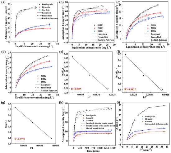 (a) Isothermal adsorption model of iron minerals, isothermal adsorption models of (b) ferrihydrite, (c) goethite, and (d) hematite at different temperatures. Van ‘t Hoff curve of adsorption of PAA by (e) ferrihydrite, (f) goethite, and (g) hematite. (h) Kinetic model of iron minerals. (i) Intragranular diffusion model.