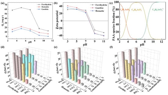 (a) The effect of different pH conditions on the adsorption effect of iron minerals on PAA. (b) Zeta potential diagram of iron minerals. (c) Relationship between the presence of PAA and pH. Effect of coexisting anions on adsorption of PAA by (d) ferrihydrite, (e) hematite, and (f) goethite.