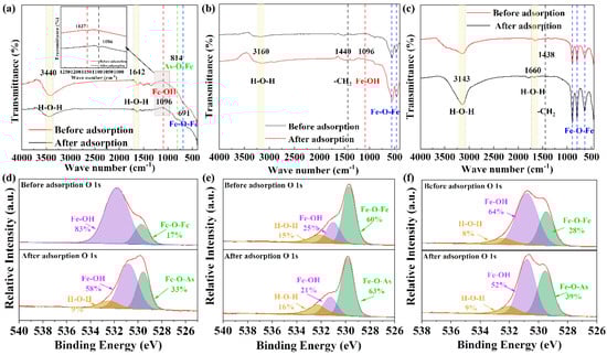 Figure 5a–c shows the FTIR spectra of the three different iron minerals. According to Figure 5a, after the adsorption of PAA by ferrihydrite, relatively strong peaks appeared near 3440 cm−1 and 1642 cm−1, which was attributed to the stretching vibration of hydroxyl groups in water  []. The peaks at 691 cm−1 and 419 cm−1 belong to the vibration of the Fe-O bond. Before adsorption, the stretching vibration of hydroxyl groups in hydroxyl oxide appeared at 1137 cm−1. After adsorption, the characteristic peak was redshifted to 1096 cm−1. This phenomenon may be caused by hydrogen bonding between the hydroxyl group in the ferrihydrite and PAA, which decreases the bonding force constant of the hydroxyl group. At the same time, the characteristic peak of As-O-Fe was formed at 814 cm−1 in the adsorbed ferrihydrite{10}, which further proved that the adsorption of PAA on ferrihydrite occurred. It can be seen from Figure 5b that there were some obvious characteristic peaks in the FTIR spectra of hematite. Before and after adsorption, the stretching vibration peaks of the hydroxyl groups in water appeared near 3160 cm−1 and 1671 cm−1 in the two samples. The peaks at 556 cm−1 and 474 cm−1 belong to the vibration of the Fe-O bond  []. Before adsorption, the stretching vibration belonging to hydroxyl group appeared at 1136 cm−1 for hematite. After adsorption, the characteristic peak was redshifted to 1094 cm−1. The reason for this phenomenon may be that the hydroxyl group in hematite is hydrogen-bonded with PAA, which reduces the bonding force constant of the hydroxyl group. At the same time, the peaks of the Fe-O bond moved from 556 cm−1 and 474 cm−1 to 550 cm−1 and 461 cm−1, respectively. However, the characteristic peak of As-O-Fe still did not appear in the spectrum of hematite after adsorption []. In addition, compared with before adsorption, after adsorption, hematite has an obvious peak at 1440 cm−1, which represents the characteristic vibration of -CH2 []. Compared with the FTIR spectrum of ferrihydrite, some obvious characteristic peaks appeared in the FTIR spectra of goethite (Figure 5c). Before and after adsorption, the two samples showed strong peaks near 3143 cm−1 and 1660 cm−1, which were caused by the stretching vibration of hydroxyl groups in water. Strong peaks of Fe-O bonds appeared at 892 cm−1, 795 cm−1, and 639 cm−1. Unfortunately, the characteristic peak of Fe-O-As did not appear in the spectra after adsorption, but it did not mean that there was no chemical interaction between goethite and PAA, but was probably due to the low adsorption capacity []. In addition, compared with before adsorption, goethite has an obvious peak at 1438 cm−1 after adsorption, which was attributed to the characteristic vibration of -CH2 [].