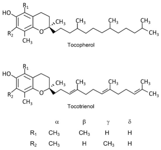 Structures of compounds belonging to the vitamin E group. Reprinted/adapted with permission from Ref. [5]. Copyright 2019, copyright Niki, E.; Abe, K.