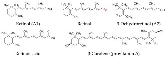 Vitamin A is a term referring to several chemical compounds belonging to the group of carotenoids, including retinol and its derivatives and beta-carotene. All forms of vitamin A include substances belonging to polyenes, so they have a similar structure and have a β-ionone ring configuration [13]. There are three main forms of vitamin A, apart from retinol (vitamin A1), derived from animal products, i.e., retinoic acid, retinal, and 3-dehydroretinol (vitamin A2), as well as carotenoids (provitamin A), of plant origin. Formulas of compounds belonging to the vitamin A group are shown in Figure 2 [14,15].