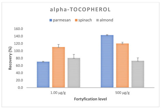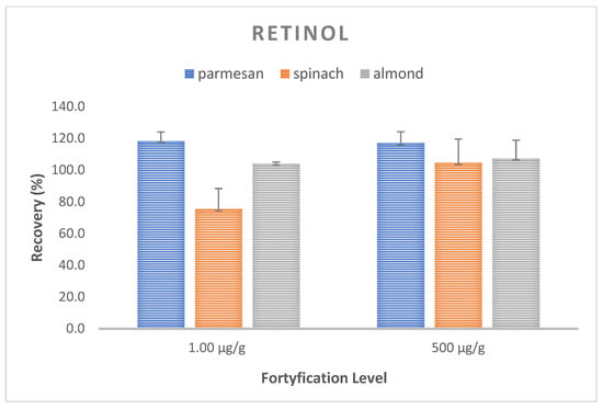 Trueness and precision expressed as the mean recovery and CV were evaluated for the optimized method by performing recovery experiments at two concentrations. The analysis of the spiked samples was performed in three replications at each level. The mean recovery of retinol in the samples ranged from 98.8–110.1%, with an average CV of 8.9% (117.0–118.4%, CV 5.7–7.1% for the Parmesan matrix; 75.4–104.6%; CV 13.0–15.0% for spinach; and 104.1–107,4%, CV 1.0–11.5% for almonds) (Figure 3). On the other hand, for alfa-tocopherol, the average recovery ranged from 70.6 to 143.2% with the mean CV equal to 6.5%, with 70.6–143.2.7%, CV 5.2–5.7% for the Parmesan matrix; 110.5–120.2%, CV 3.5–7.0% for spinach; and 73.0–80.9%, CV 7.9–9.6% for almonds. These values met the requirements of the FDA and ICH recommendations [39,40], with the recovery ranging from 70 to 120%, with a coefficient of variation (CV) of ≤15% (Figure 4).