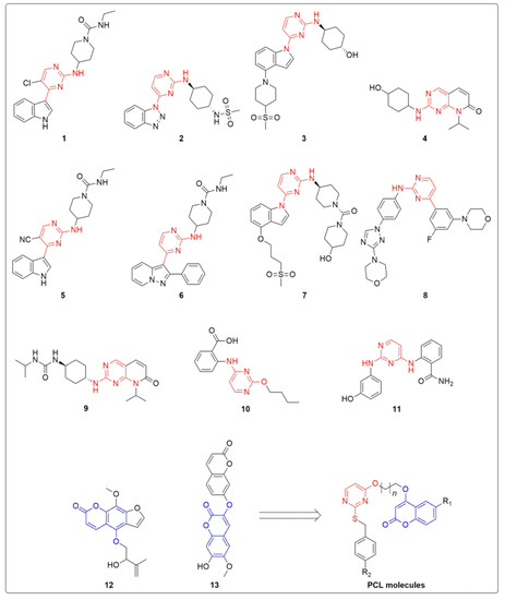 Based on the availability of inhibitors that target c-Jun N-terminal kinase (JNK), the compounds may be classed into various groups, such as open and closed conformation binders, gatekeeper residue binders, peptide-based inhibitors, covalent inhibitors, and inhibitors of type II kinases [6]. Structure-based analysis herein revealed that most of the co-crystal structures of ligands and JNK includes aminopyrimidines as a central scaffold, where most aminopyrimidines bind to the ATP pocket of JNK containing the closed conformation of Met146, which is responsible for the interaction of all JNK isoforms [7]. According to X-ray crystallography, the indazole–aminopyrimidine compound binds to JNK1b (PDB: 4HYU) and interacted via two hydrogen bonds with the amino acid backbones of the hinge region [8]. A co-crystal structure of JNK3 (PDB: 3KVX) and the aminopyridine ligand revealed that it was positioned within the adenosine-binding region, and the morpholino substituent was positioned within the hydrophilic sugar pocket [9]. It was also observed in a co-crystal structure of JNK3 (PDB: 4Y5H) that two hydrogen bonds with Met149 were formed at the adenine-binding site [10]. Furthermore, pyrimidine-based ligands and the crystal structure of JNK1 (PDB: 2NO3) revealed that two hydrogen bonds formed with the hinge region Met111 [11]. In the search for a novel JNK inhibitor, chemical structures 1–11 were potent, selective, and orally active inhibitors. In addition to the aminopyridine scaffold, coumarin-based heterocycles, such as compounds 12 (neobyakangelicol) and 13 (daphnoretin), were observed to be potent inhibitors of JNK (Figure 1) [12,13]. In this study, pyrimidine-linked coumarin with various substitutions was synthesized to develop a hybrid structure that could target JNK in BC cells.