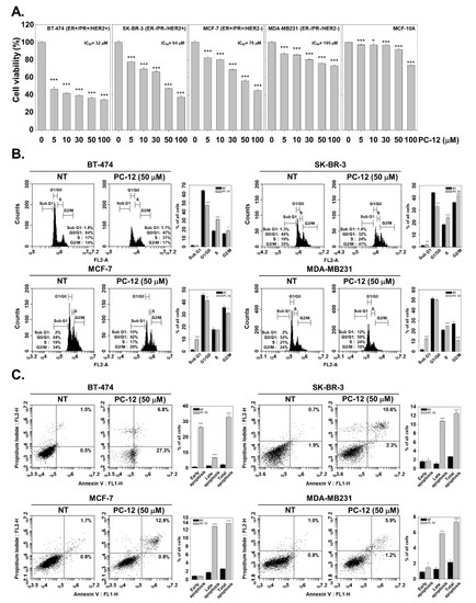 PC-12 produced loss of cell viability and induced cell cycle arrest. (A) MTT assay was performed for cell viability in PC-12-treated breast cell lines. BT-474, SK-BR-3, MCF-7, MDA-MB-231, and MCF-10A cells were treated with PC-12 (0–5–10–30–50–100 µM) for 24 h. *** p < 0.001 and * p < 0.05 vs. non-treated (NT) group. (B) Cells were exposed to PC-12 (0–50 µM) for 24 h, and cell cycle analysis was performed. *** p < 0.001, ** p < 0.01, and * p < 0.05 vs. non-treated (NT) group. (C) The four breast cancer cell lines were treated with 0–50 µM of PC-12 for 24 h, and cells were collected. The apoptotic cells were detected by flow cytometry using an Annexin/PI staining assay. *** p < 0.001 and * p < 0.05 vs. non-treated (NT) group.