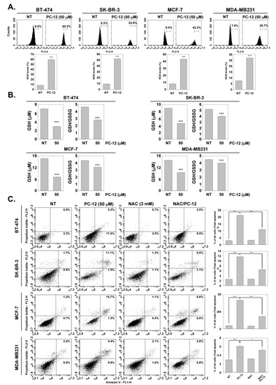 PC-12 induced apoptotic cells via ROS production. (A) PC-12 (0–50 µM) treatment in four cell lines for 12 h. The cells were collected, and ROS measurement was performed using H2DCFH-DA staining. *** p < 0.001 vs. non-treated (NT) cells. (B) PC-12 (0–50 µM) was incubated for 24 h with the four cell lines, and the GSH/GSSG assay was performed following the manufacturer’s protocol. *** p < 0.001 vs. non-treated (NT) cells. (C) BT-474, SK-BR-3, MCF-7, and MDA-MB231 cells were treated with 50 µM of PC-12 or 3 mM of NAC for 24 h, an Annexin/PI staining assay was performed to measure apoptotic cells. *** p < 0.001 and * p < 0.05 vs. non-treated (NT) group.