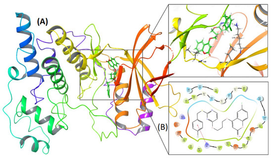 Illustrated representation of JNK3 and PC-12 complex. (A) Three-dimensional interaction of PC-12 with amino acid residues at the active site of the receptor. (B) Two-dimensional interaction diagram of JNK3 and PC-12.