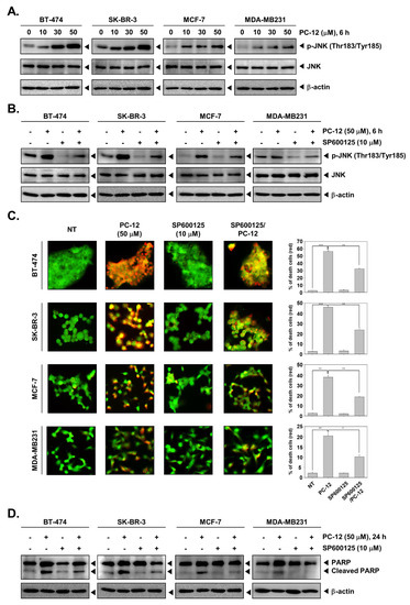 Next, it was determined which signaling pathway induced apoptosis upon treatment of BC cells with PC-12. One hypothesis, “breaking the brake”, states that the process of apoptosis depends on JNK expression [37]. Treatment with various concentrations of PC-12 led to increased phosphorylation of JNK (p-JNK) in all four cell lines, although JNK expression remained constant (Figure 8A). In addition, co-treatment with SP600125, a JNK inhibitor [38], reversed the effect of the increased expression of p-JNK observed with PC-12 treatment (Figure 8B). Furthermore, co-treatment of BC cells with SP600125 and PC-12 reduced the percentage of dead cells. The proportion of dead cells was reduced upon co-treatment with SP600125 and PC-12, from approximatley 20% to 10% in MDA-MB-231 cells, from 38% to 20% in MCF-7 cells, from 48% to 25% in SK-BR-3 cells, and from 55% to 30% in BT-474 cells (Figure 8C). In addition to the percentage of dead cells, the cleavage of PARP protein was also modulated. As shown in Figure 8D, PC-12 treatment promoted PARP cleavage, but the observed elevated PARP cleavage levels consequent to PC-12 treatment were reversed with SP600125 treatment. These results suggest that PC-12 induced apoptosis through increased JNK activity.