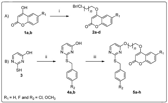 Schematic representation of the synthesis of title compounds (5a–h). A, synthesis of coumarin based alkyl halides (2a–d); B, reactivity representation of alkylated thio-uracil and (2a–d). Reagents and conditions: (A), (i) 1,2-dibromoethane/1-bromo-3-chloro propane, DMF, K2CO3, reflux; (B), (ii) substituted benzyl bromides or benzyl chlorides, EtOH:H2O (1:1), KOH, 45 °C; (iii) (2a–d), acetone, K2CO3, reflux.