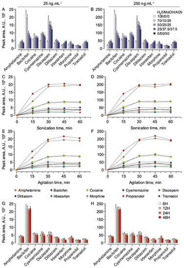 - Saussereau, E.; Lacroix, C.; Gaulier, J.M.; Goulle, J.P. On-line liquid chromatography/tandem mass spectrometry simultaneous determination of opiates, cocainics and amphetamines in dried blood spots. J. Chromatogr. B 2012, 885, 1–7. [Google Scholar] [CrossRef]