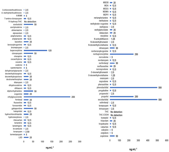 - Dos Santos, B.P.; Eller, S.; Borges, G.R.; de Gouveia, G.C.; Sebben, V.C.; Arbo, M.D.; de Oliveira, T.F. A multi-analyte LC-MS/MS method for the determination of 57 pharmaceuticals and illicit drugs in plasma, and its application to poisoning cases. J. Pharm. Biomed. Anal. 2023, 222, 115082. [Google Scholar] [CrossRef]