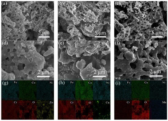 SEM images and EDS-mapping of (a,d,g) HEO-Zn, (b,e,h) HEO-Cu, and (c,f,i) HEO-Mn samples, respectively.