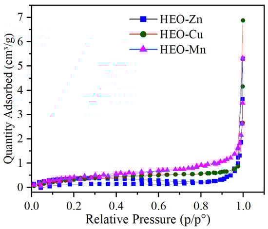 The nitrogen adsorption-desorption isotherm of HEO-Zn, HEO-Cu, and HEO-Mn.