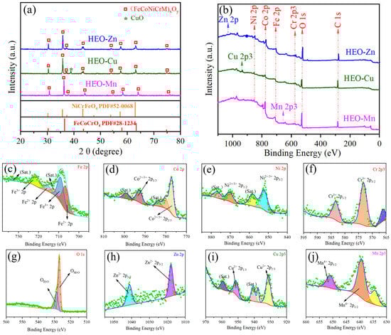 (a) XRD patterns, (b) XPS spectrums of HEO-Zn, HEO-Cu, and HEO-Mn samples. (c–g) are the XPS spectra of Fe 2p, Co 2p, Ni 2p, Cr 2p, and O 1s of HEO-Cu, and (h–j) are the XPS spectra of Zn 2p of HEO-Zn, Cu 2p of HEO-Cu, and Mn 2p of HEO-Mn, respectively.