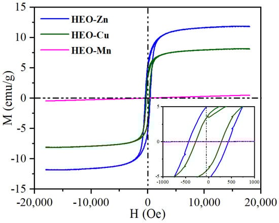 The hysteresis loops of the as-obtained samples of HEO-Zn, HEO-Cu, and HEO-Mn.