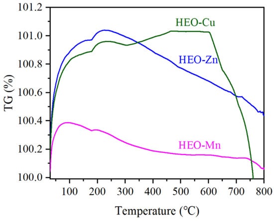 Figure 6 shows the DTG curves of the three ferrites of HEO-Zn, HEO-Cu, and HEO-Mn, which present the changing trend in mass with reference to temperature. It can be seen that, below 200 °C, there is a small mass increase for all the samples (the maximum ratio is about 1.0% for HEO-Zn and HEO-Cu), mainly owing to the secondary oxidation of the sample surface. Moreover, with the increase in temperature, the mass continues to decrease. Significantly, although raising the temperature up to 800 °C, the mass change is still very small (less than 1.0%). The above results indicate the ultra-high structural stability of these HE spinel ferrites at high temperatures.