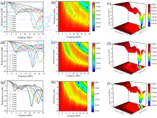 The RL curves, and 2D, 3D color-maps at different matching thickness of (a–c) HEO-Zn, (d–f) HEO-Cu, and (g–i) HEO-Mn.