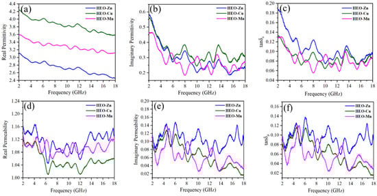 (a) The real part (ε′), (b) imaginary part (ε″) of permittivity, (c) dielectric loss tangent (tanδε), and (d) the real part (µ′), (e) imaginary part (µ″) of permeability, (f) magnetic loss tangent (tanδµ) of HEO-Zn, HEO-Cu, and HEO-Mn samples.